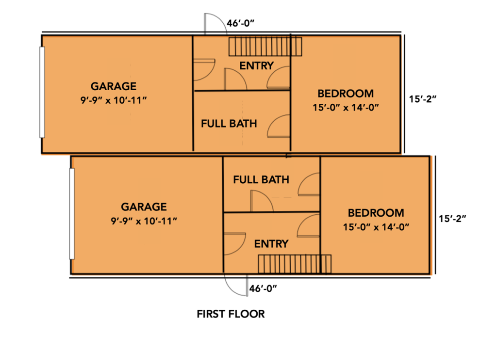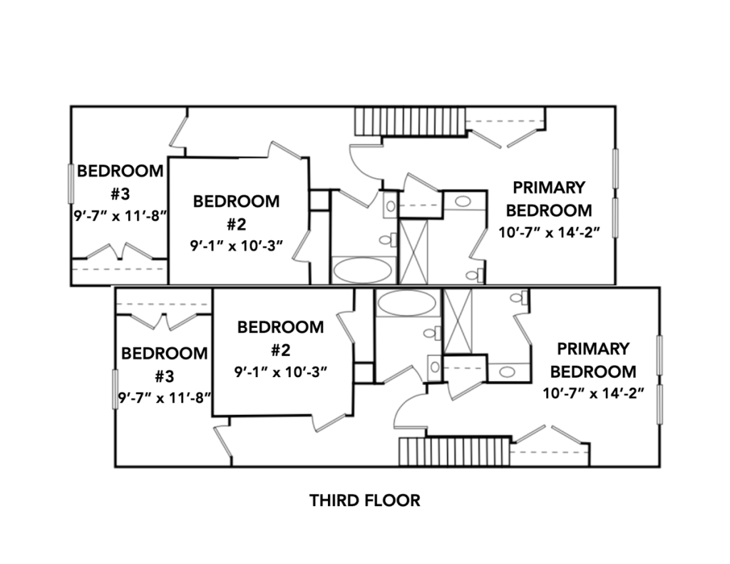 Thoughtfully designed with two separate private front entrances, the 3-story Crane duplex is a larger family-friendly option that includes four bedrooms and 3.5 bathrooms, while still efficiently accommodating the Crane lot type. The first floor boasts a spacious interior garage, bedroom / study, and full bathroom. The kitchen, dining room and living room are above on the second floor, with a half bath, while the primary bedroom with en suite bath are on the third floor, along with two additional bedrooms and a full bath.